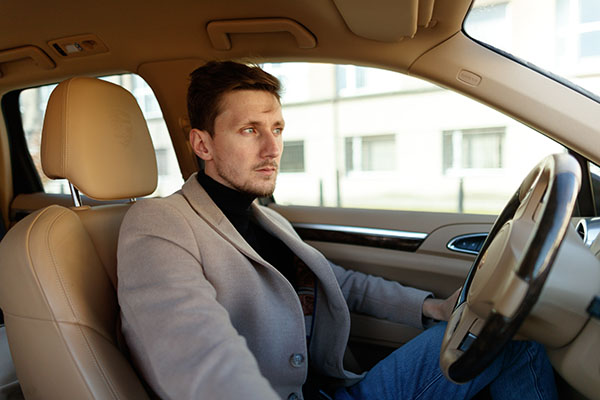 Handsome caucasian man is looking through the windscreen in the new beige car saloon